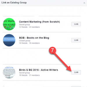 Another window will pop up and you can select your group. Once you’ve selected your group, the next step is to click the link button. After 2 or 3 seconds, you’ll have a green tick appear instead of the link button. This indicates your group is now linked to your Facebook page.